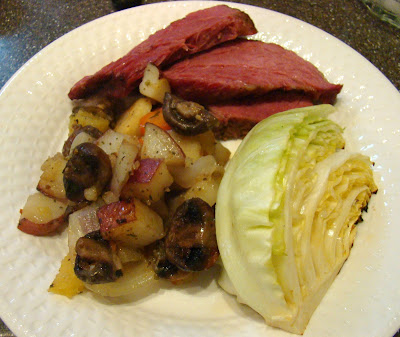 Remove outer layer of leaves and trim stem if needed. Do not remove the core, this will hold the wedges together for baking. Cut into 8- wedges with core still intact. Place in a greased roasting pan. Drizzle with a few DROPS of olive oil, sprinkle with salt & pepper, and a drizzle of the braising liquid from the Corned Beef. Roast uncovered for 20-30 min. in a 450' oven. (I did this at the latter part while roasting the other vegetables.)